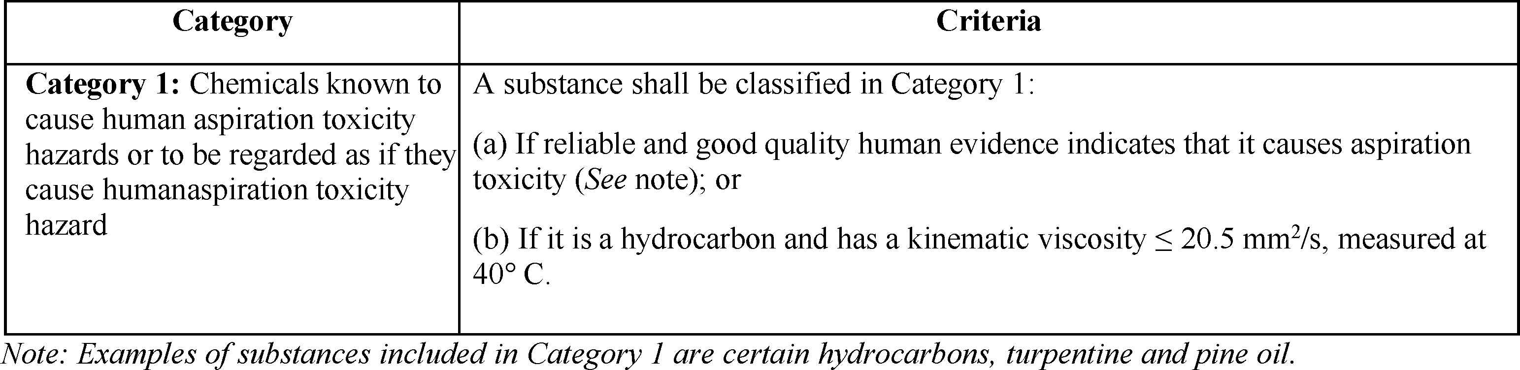 Table A.10.1: Criteria for Aspiration Toxicity