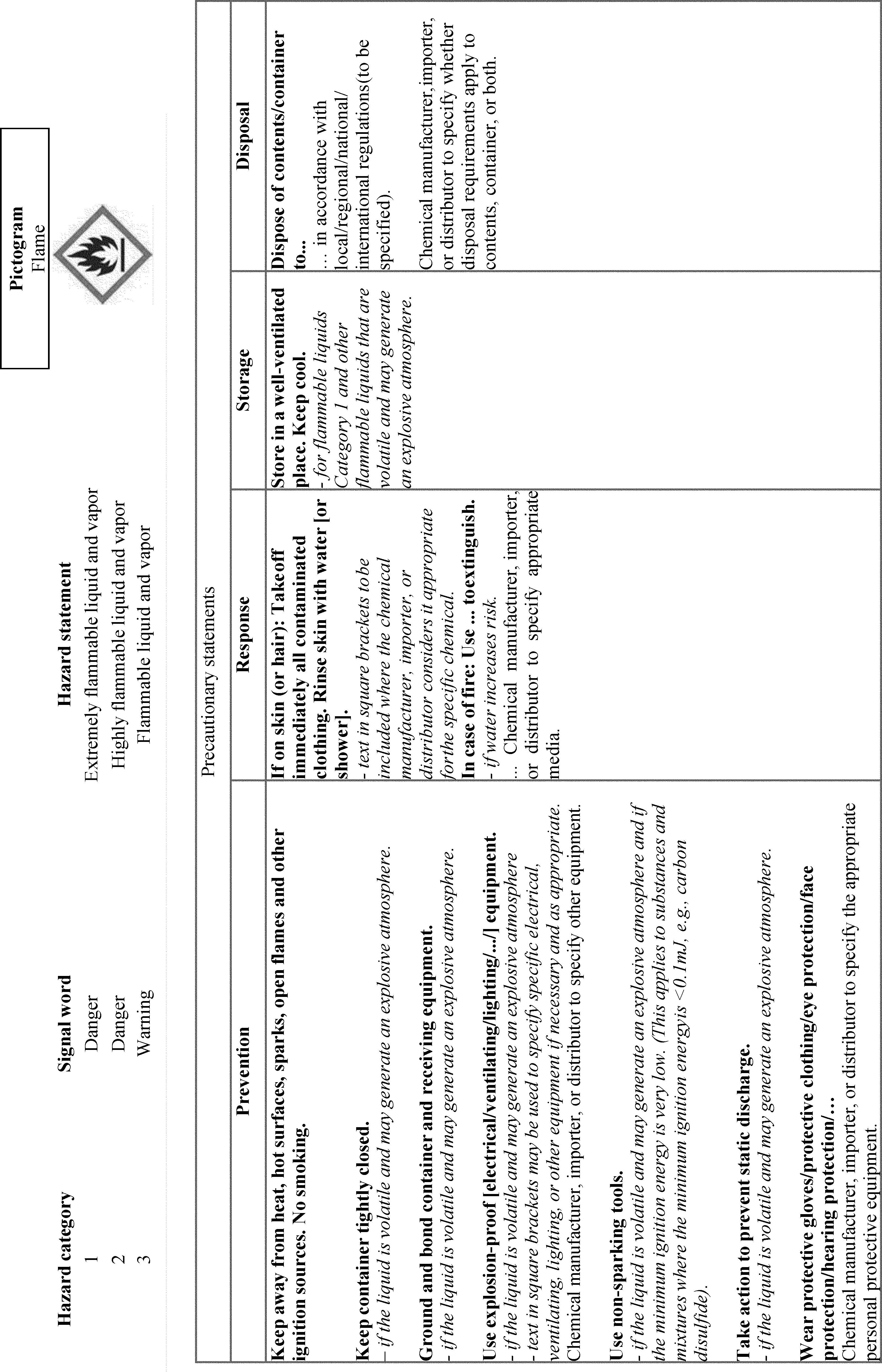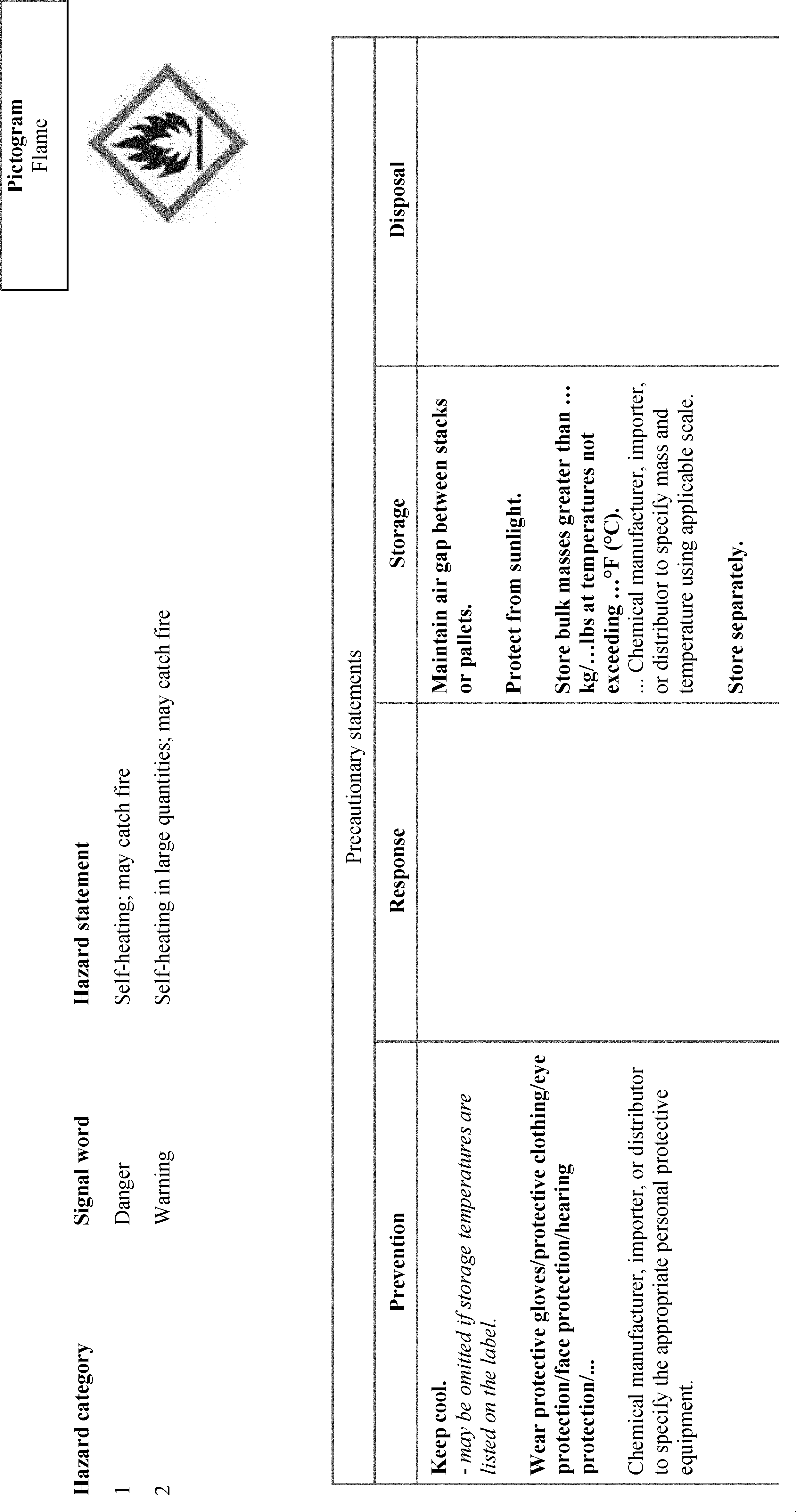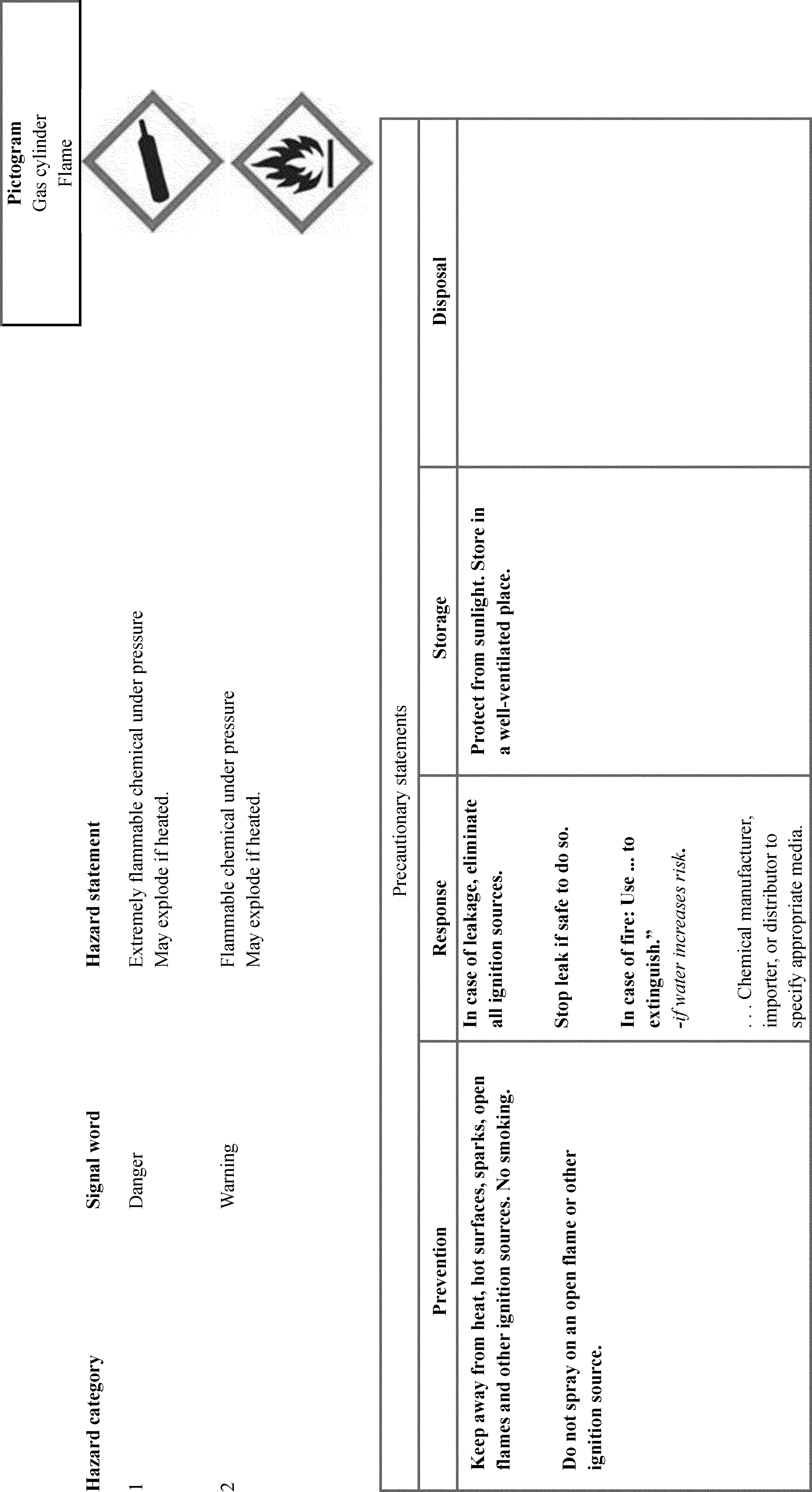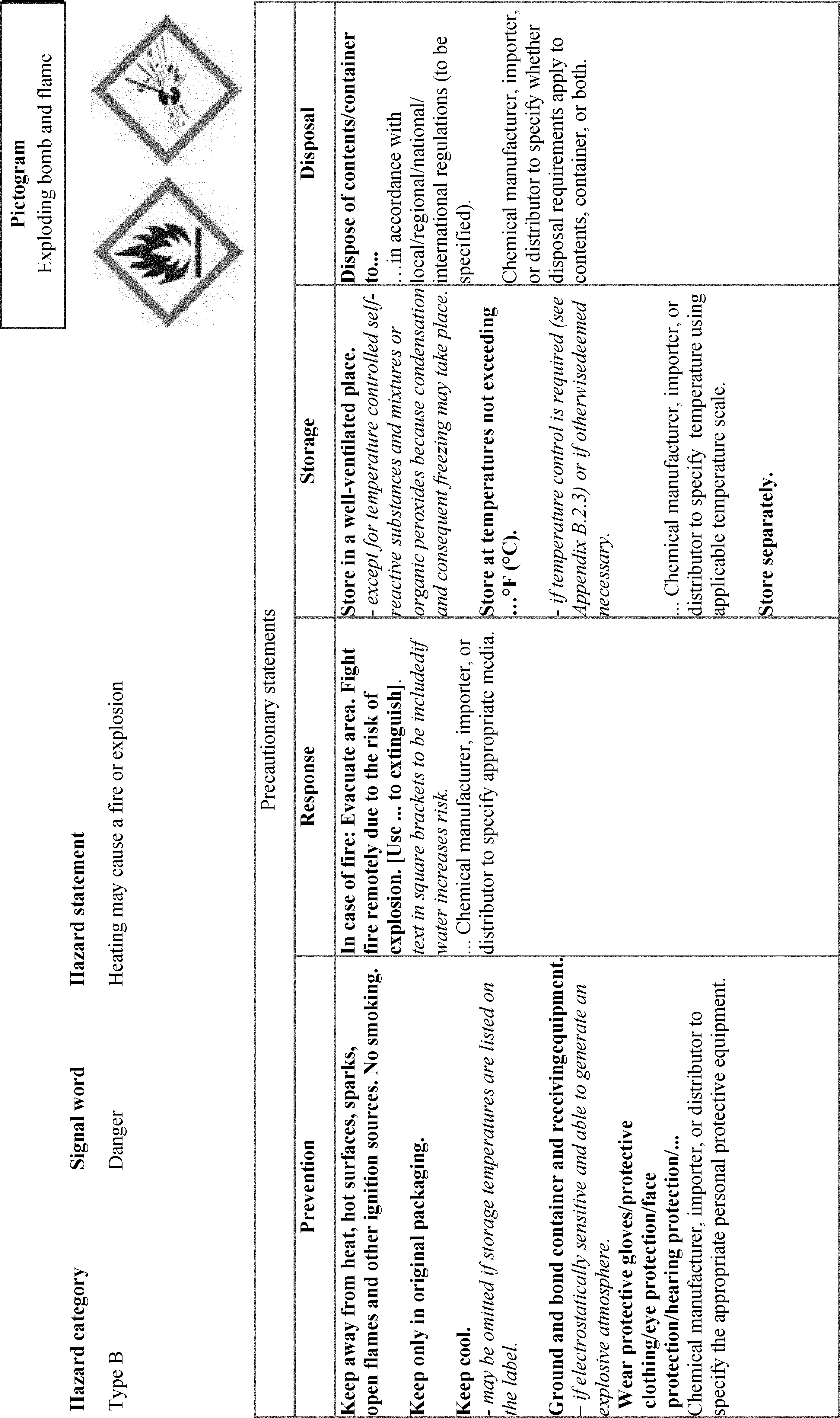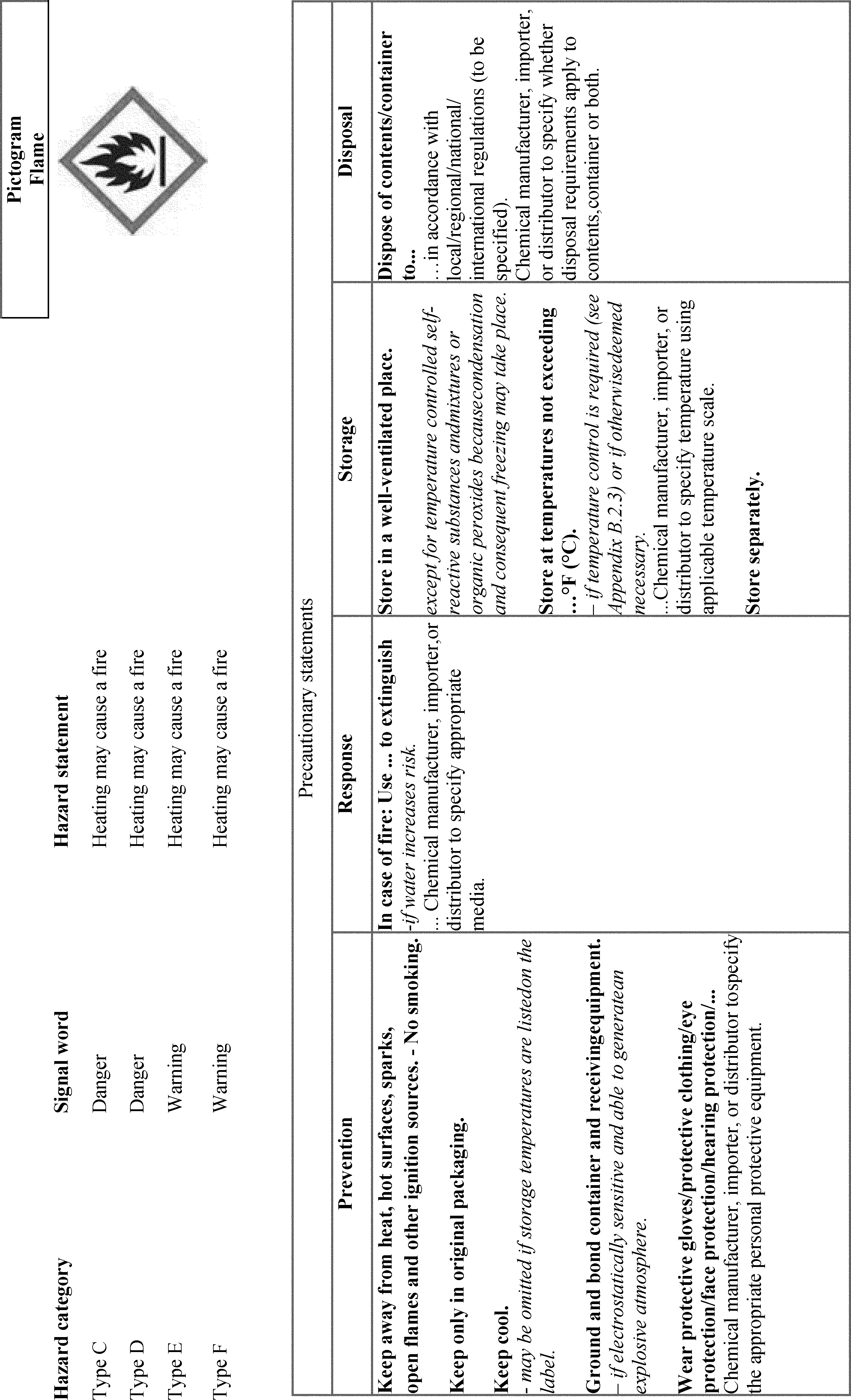 un-bolding font and removing slashes that were inadvertently included. Additionally, OSHA is adding “Chemicals Under Pressure” to Figure C.1. This was inadvertently omitted from the list of hazard classes associated with the Gas Cylinder hazard symbol. OSHA is also updating the text of C.2.4.6 to use the updated version of the example precautionary statement. OSHA is also making a number of corrections related to Table C.4.16, including adding the precautionary statement “In case of fire: Use . . . to extinguish” and its associated explanatory note to the “Response” column of Chemical Under Pressure (Hazard Category 1 and 2). The latter change will accomplish OSHA’s stated intention to align with the GHS Rev. 8 (89 FR 44324). In Table C.4.19, OSHA is removing the phrase “Chemical manufacturer, importer, or distributor to specify applicable ignition source(s),” which it inadvertently failed to delete in this table after updating the precautionary statement to include all ignition sources (see 89 FR 44336). The agency is also adding the words “and large quantities” in C.4.30, which were inadvertently omitted from the Hazard Category 4 Response precautionary statement.