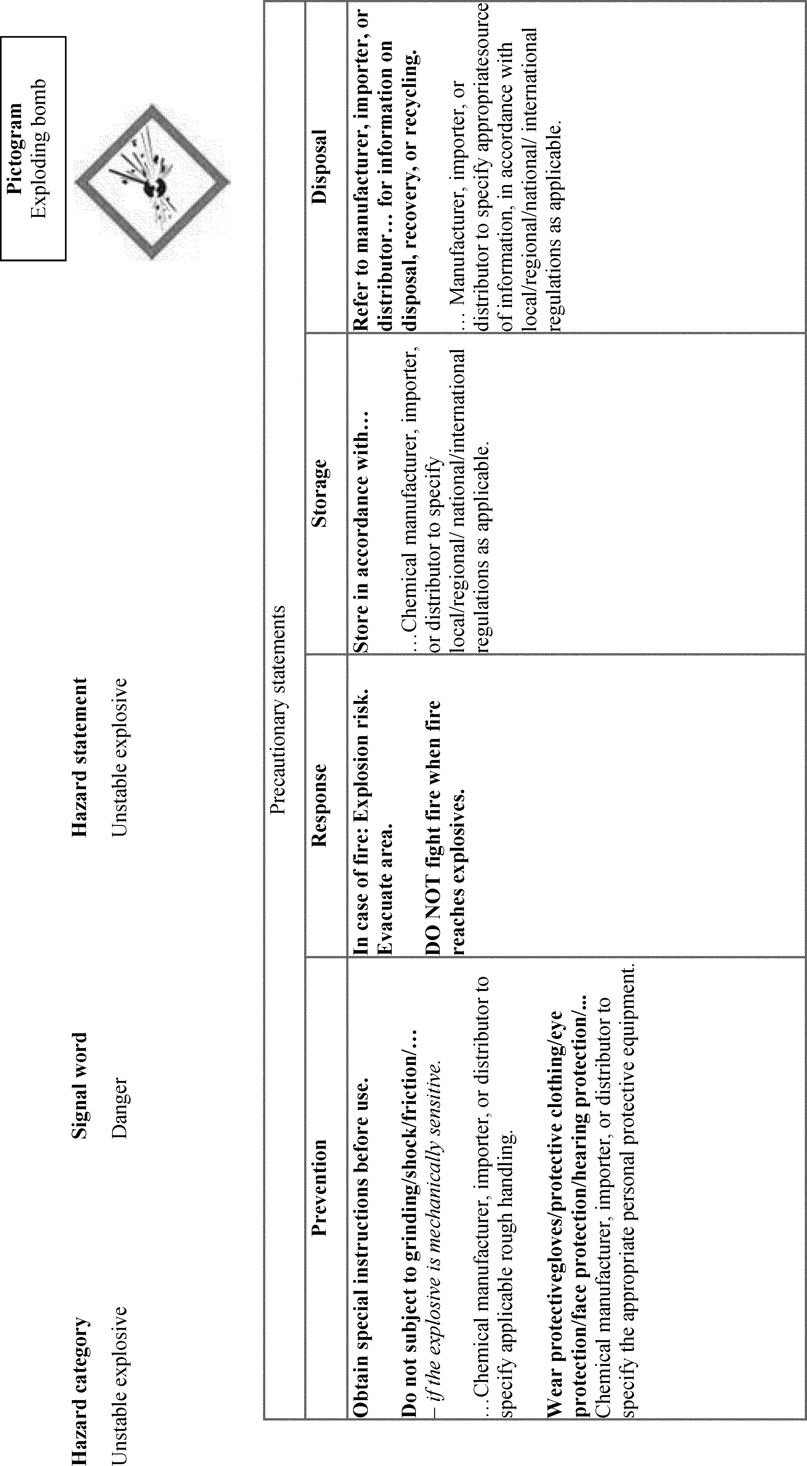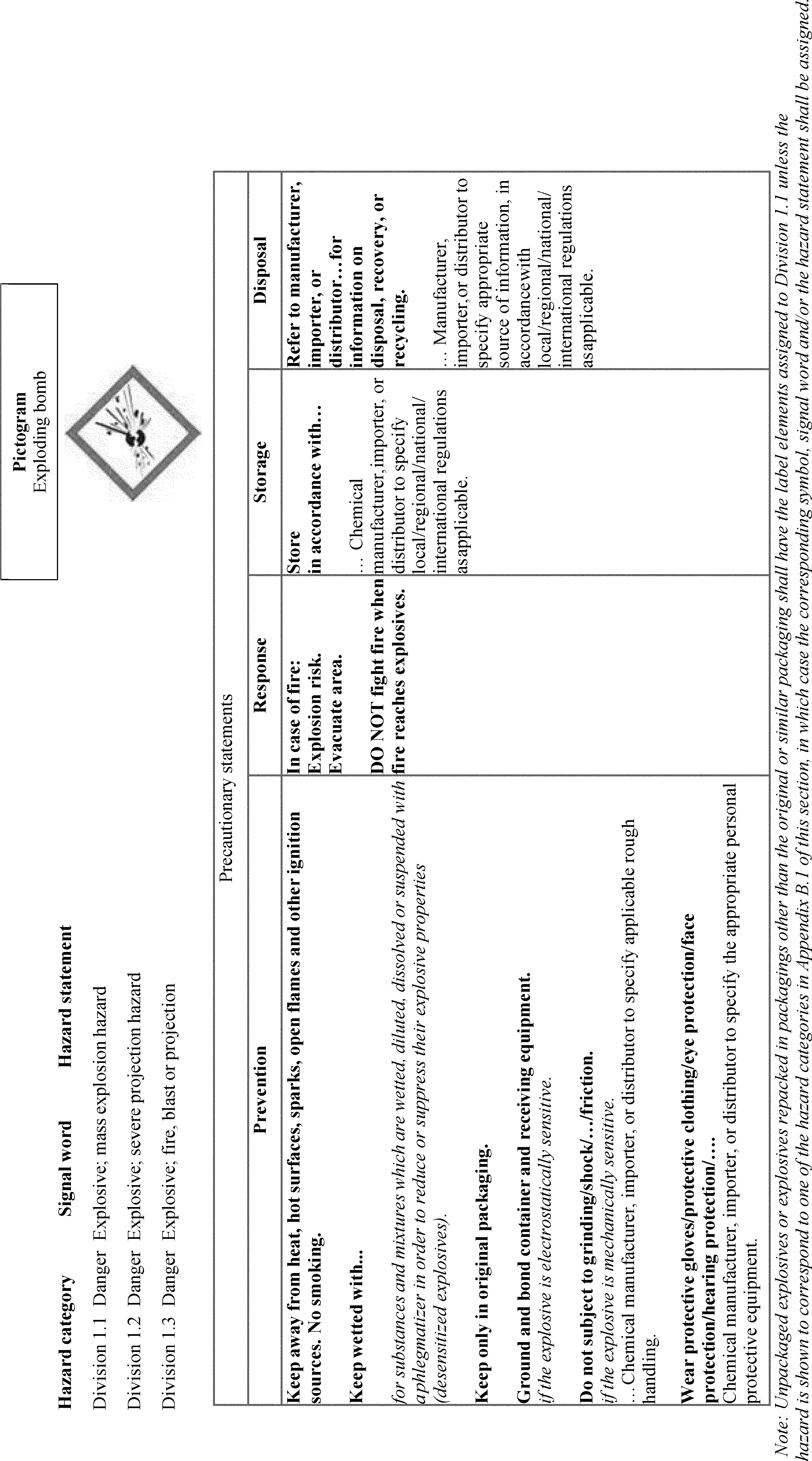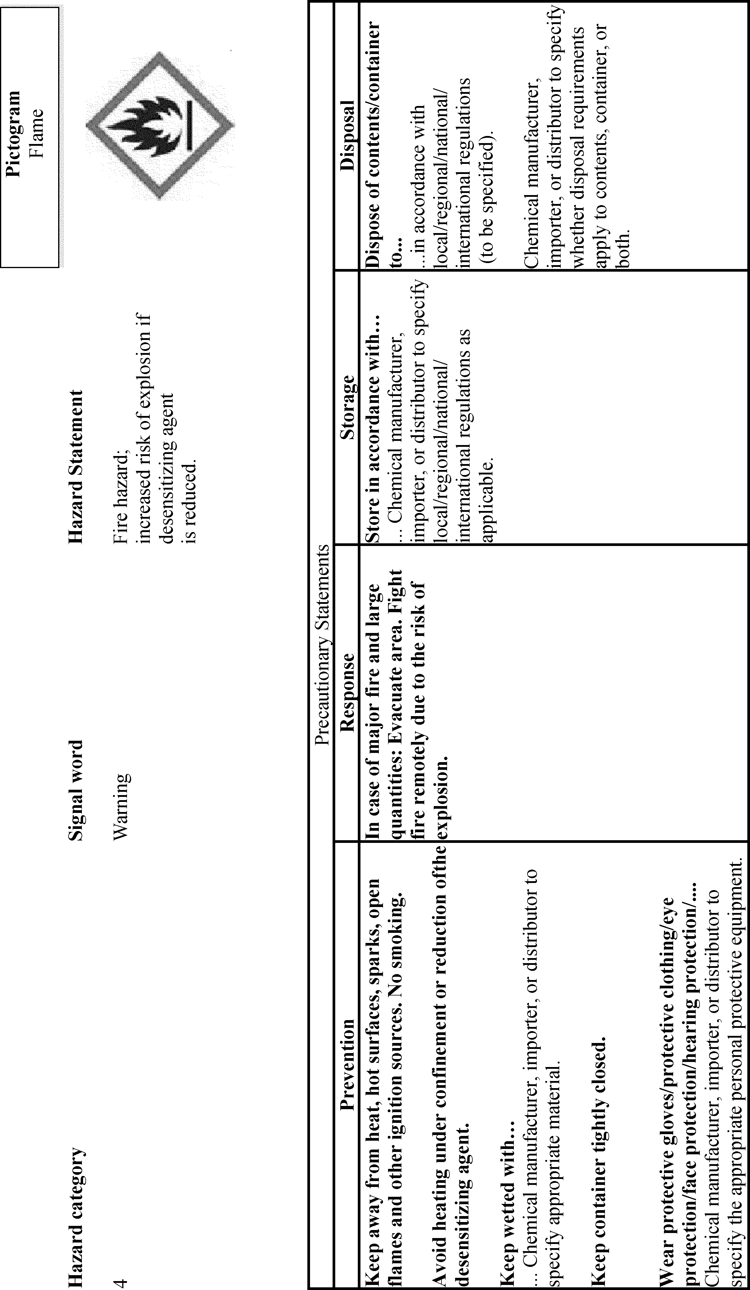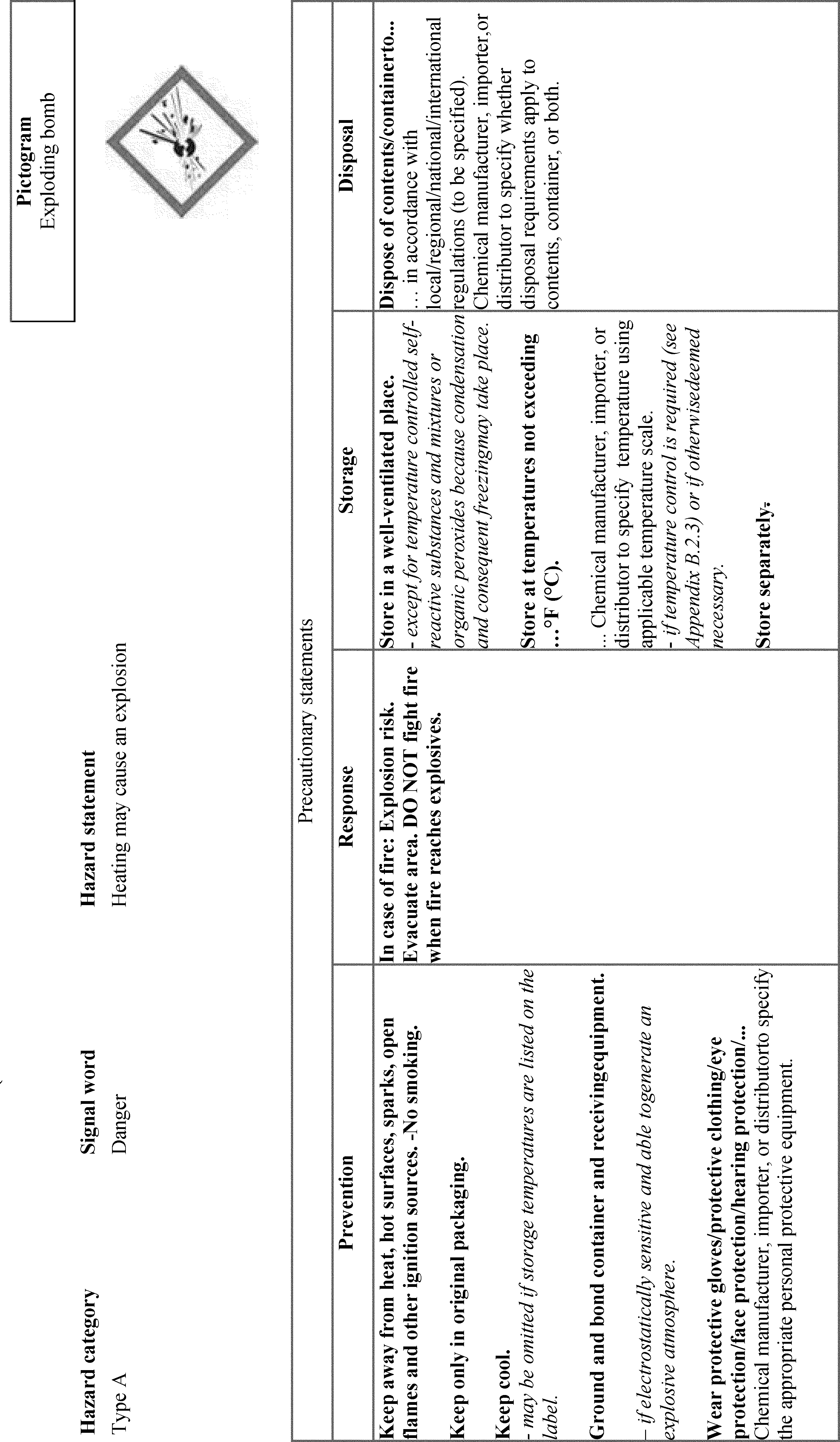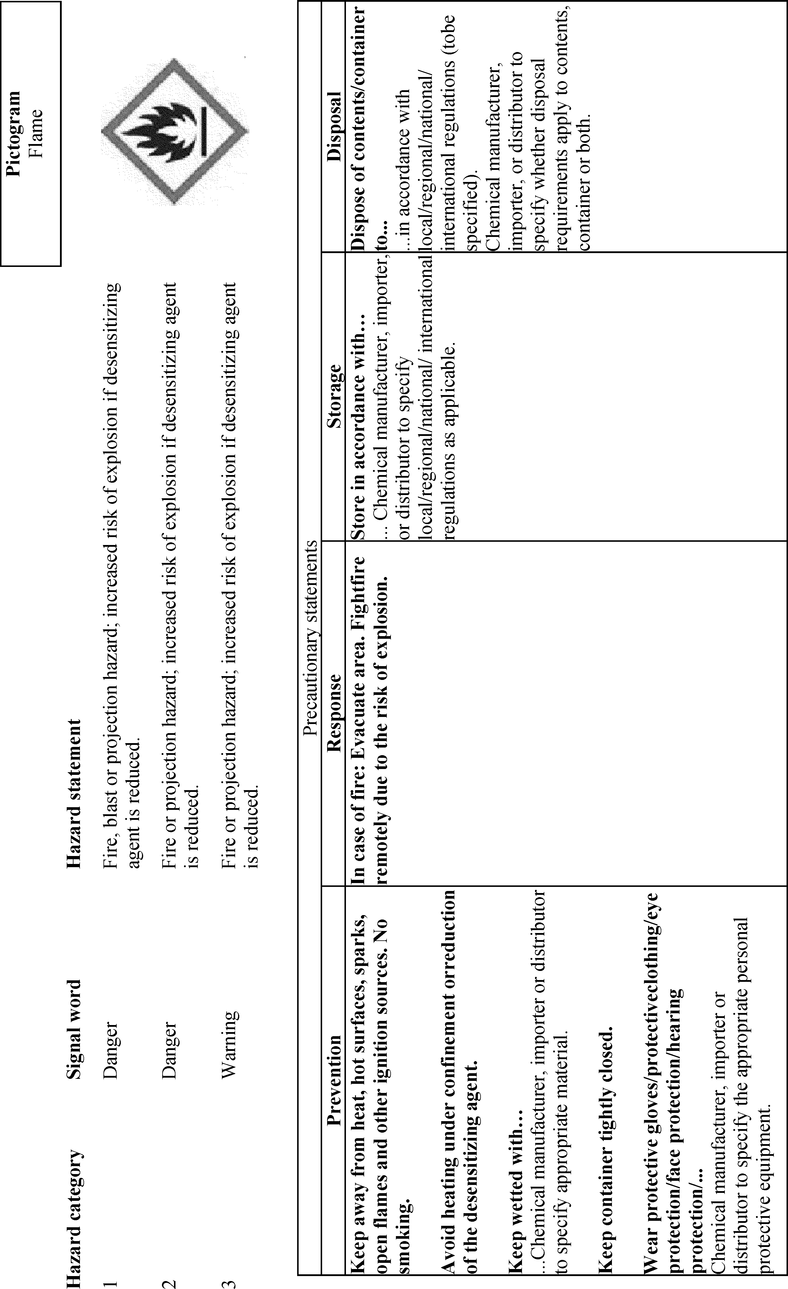 un-bolding font and removing slashes that were inadvertently included. Additionally, OSHA is adding “Chemicals Under Pressure” to Figure C.1. This was inadvertently omitted from the list of hazard classes associated with the Gas Cylinder hazard symbol. OSHA is also updating the text of C.2.4.6 to use the updated version of the example precautionary statement. OSHA is also making a number of corrections related to Table C.4.16, including adding the precautionary statement “In case of fire: Use . . . to extinguish” and its associated explanatory note to the “Response” column of Chemical Under Pressure (Hazard Category 1 and 2). The latter change will accomplish OSHA’s stated intention to align with the GHS Rev. 8 (89 FR 44324). In Table C.4.19, OSHA is removing the phrase “Chemical manufacturer, importer, or distributor to specify applicable ignition source(s),” which it inadvertently failed to delete in this table after updating the precautionary statement to include all ignition sources (see 89 FR 44336). The agency is also adding the words “and large quantities” in C.4.30, which were inadvertently omitted from the Hazard Category 4 Response precautionary statement.