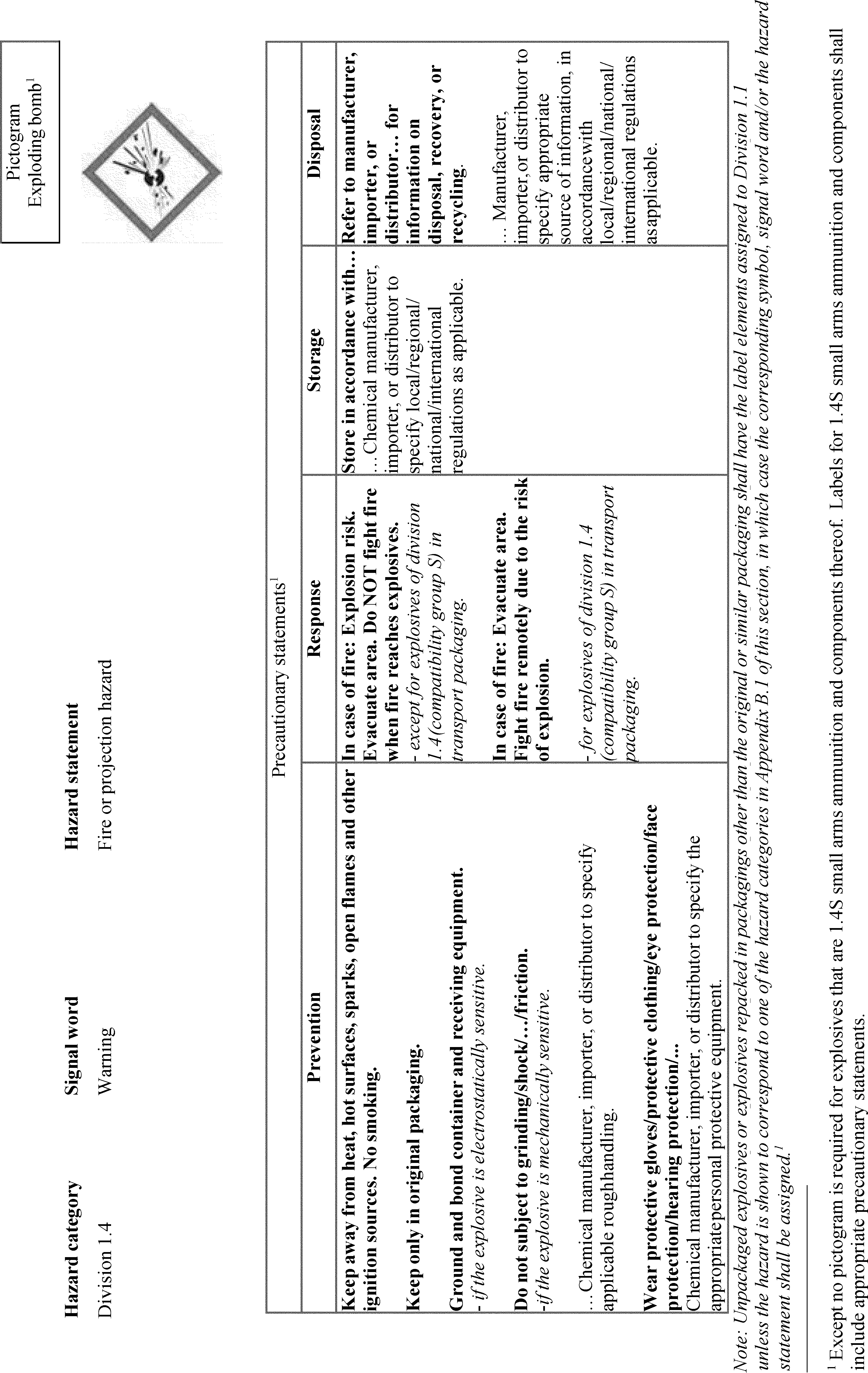 | On p. 44424 | § 1910.1200, Appendix C, C.4.14 | For Hazard category Division 1.4, in the Storage column remove the ellipsis from the middle of the precautionary statement “Store . . . in accordance with . . .” in line 1 so that it now reads “Store in accordance with . . .”. |