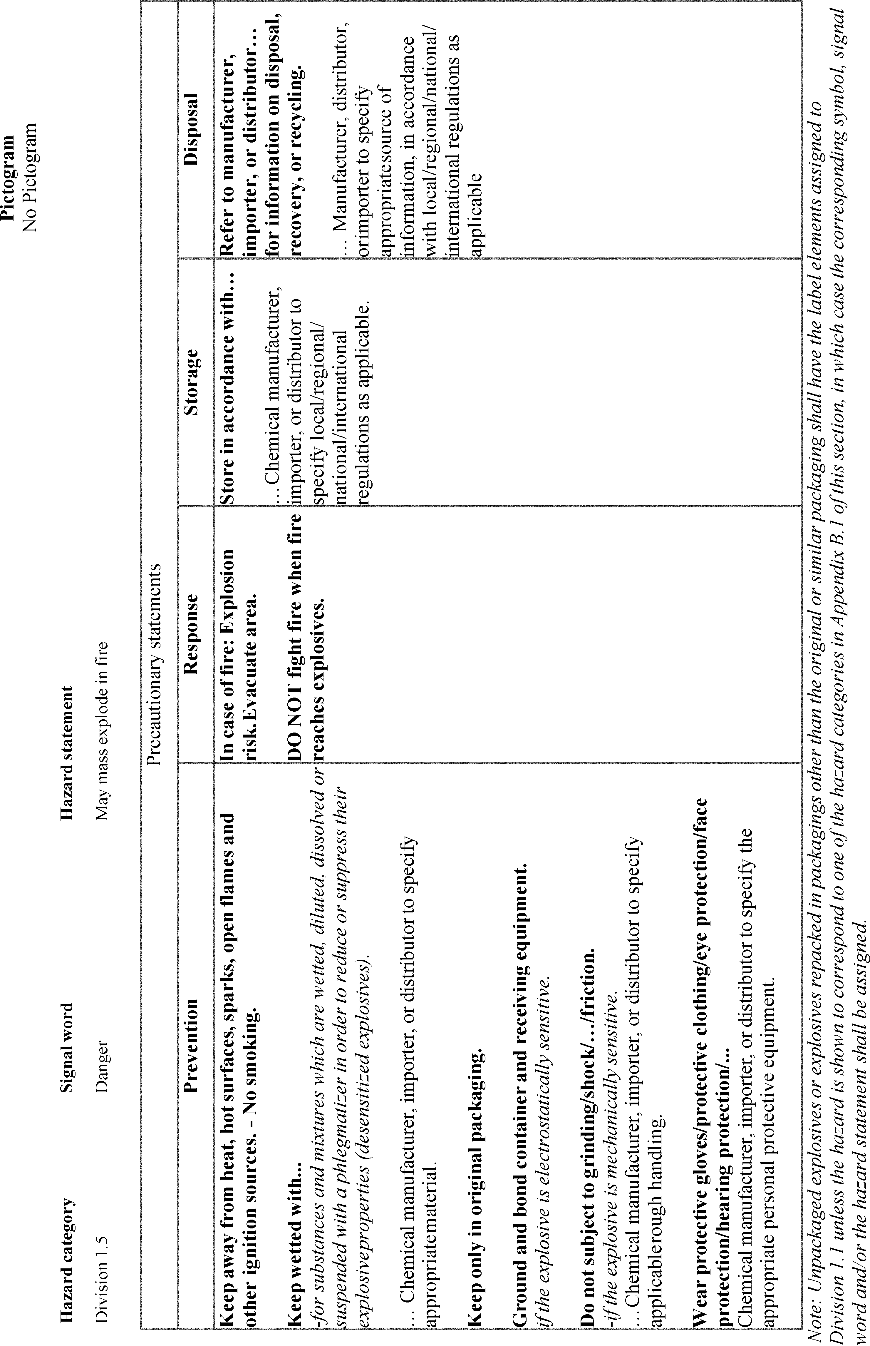 | On p. 44425 | § 1910.1200, Appendix C, C.4.14 | For Hazard category Division 1.5, in the Prevention column, remove the “/” from “Ground and/bond container and receiving equipment.” in line ten. |