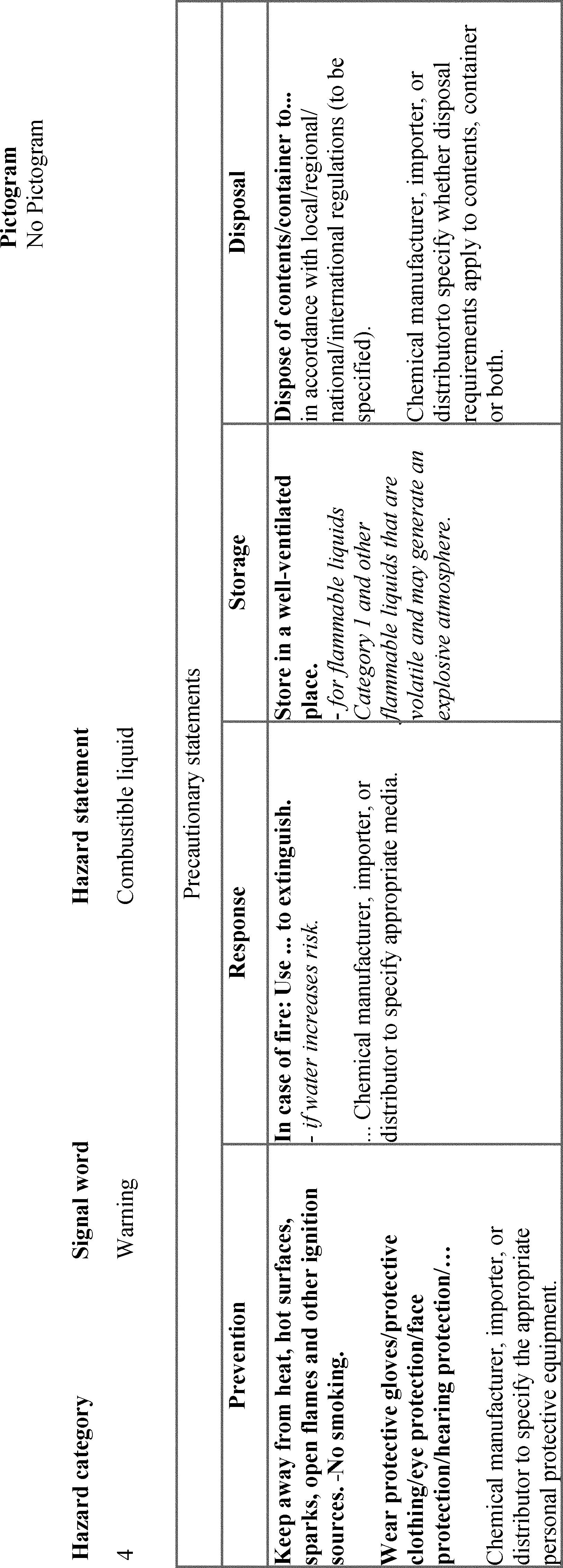 C.2.4.6 Precautionary statements may be combined or consolidated to save label space and improve readability. For example, “Keep cool” and “Keep away from heat, hot surfaces, sparks, open flames and other ignition sources. No smoking.” can be combined to read “Keep cool and away from heat, hot surfaces, sparks, open flames and other ignition sources. No smoking.”