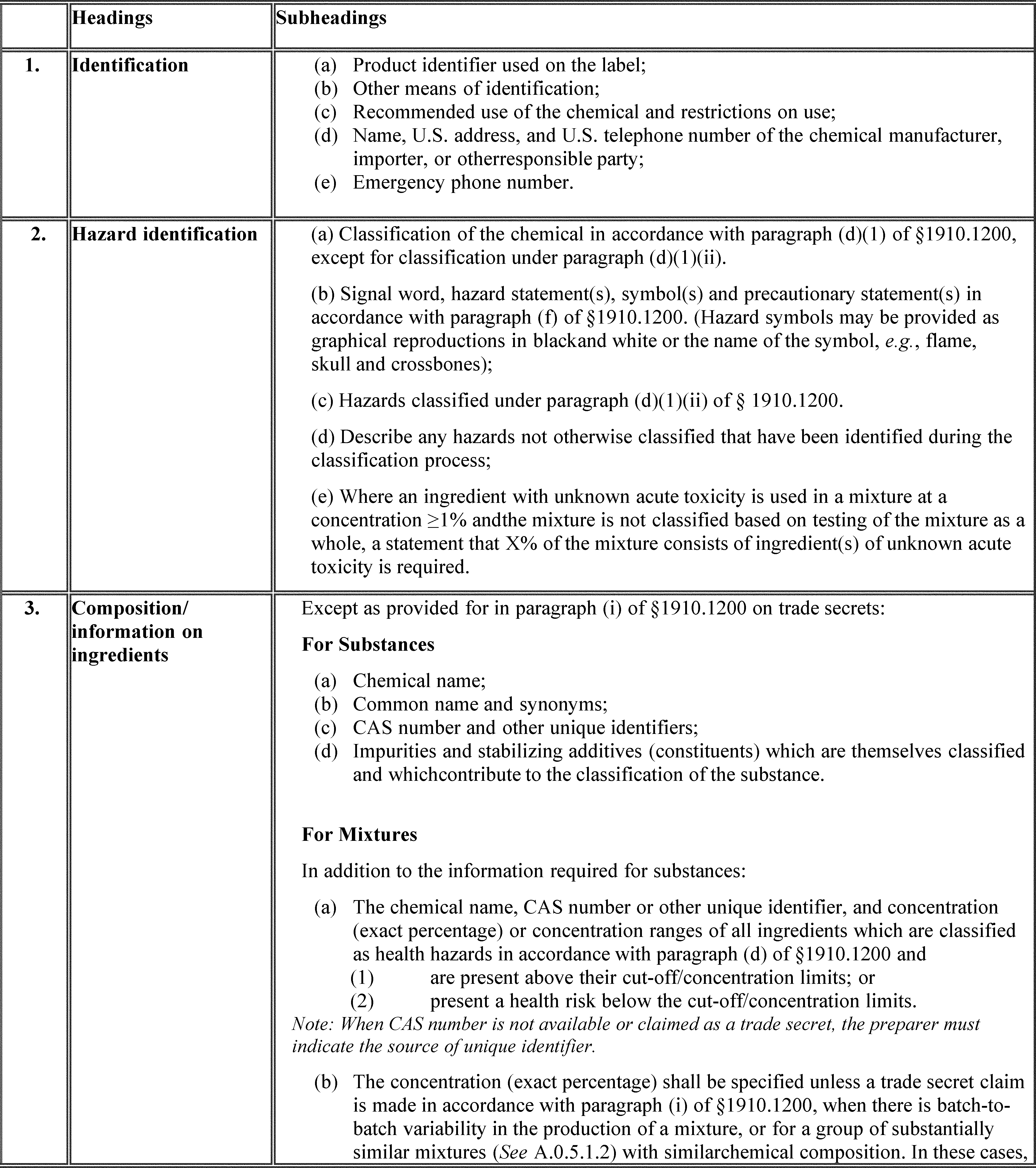 | On p. 44461 | § 1910.1200, Appendix D, Table D.1, Note | In the Note at the end of Table D.1, remove the phrases “methods specified under” and “and then listed on the SDS” from the first sentence. |