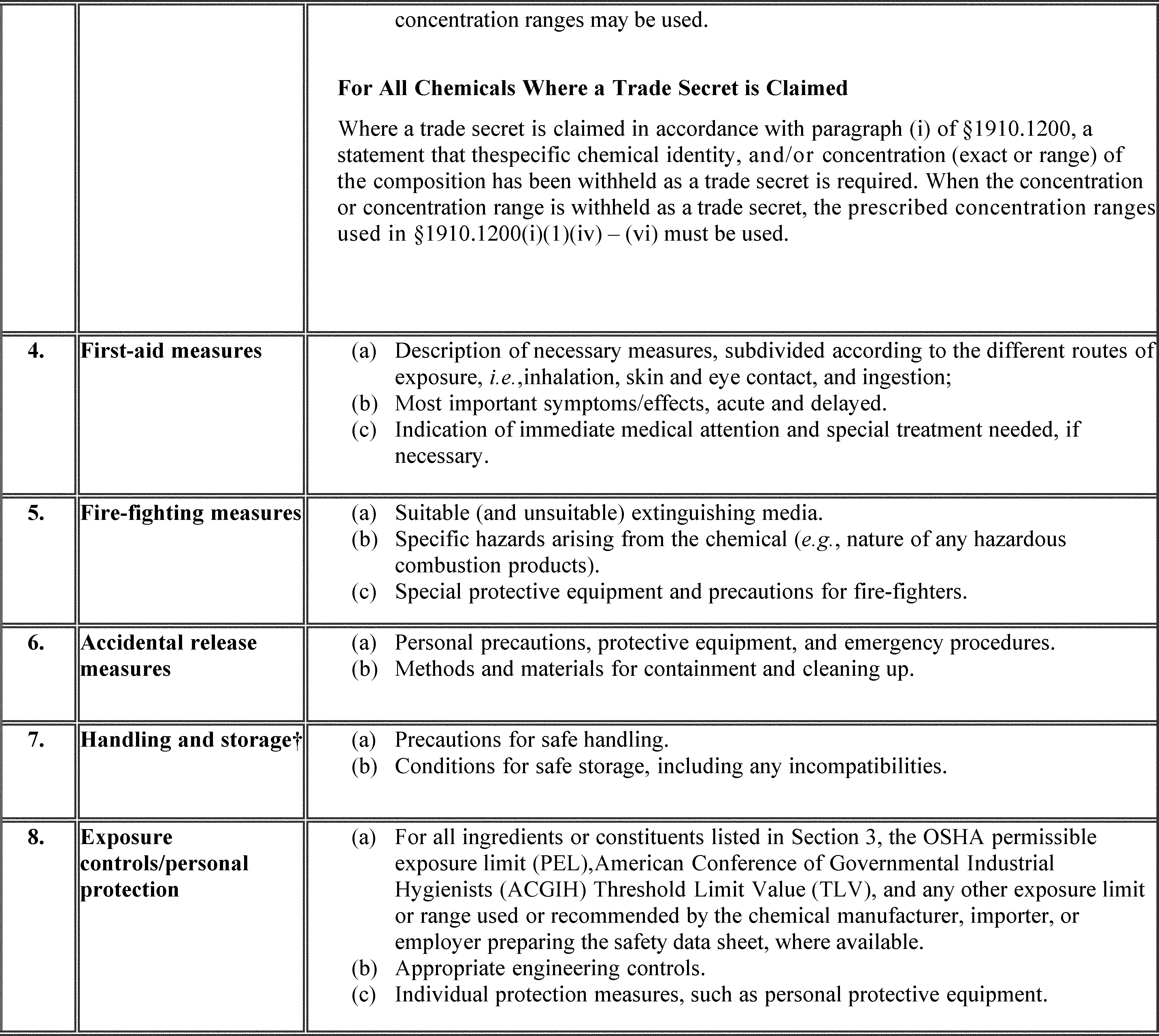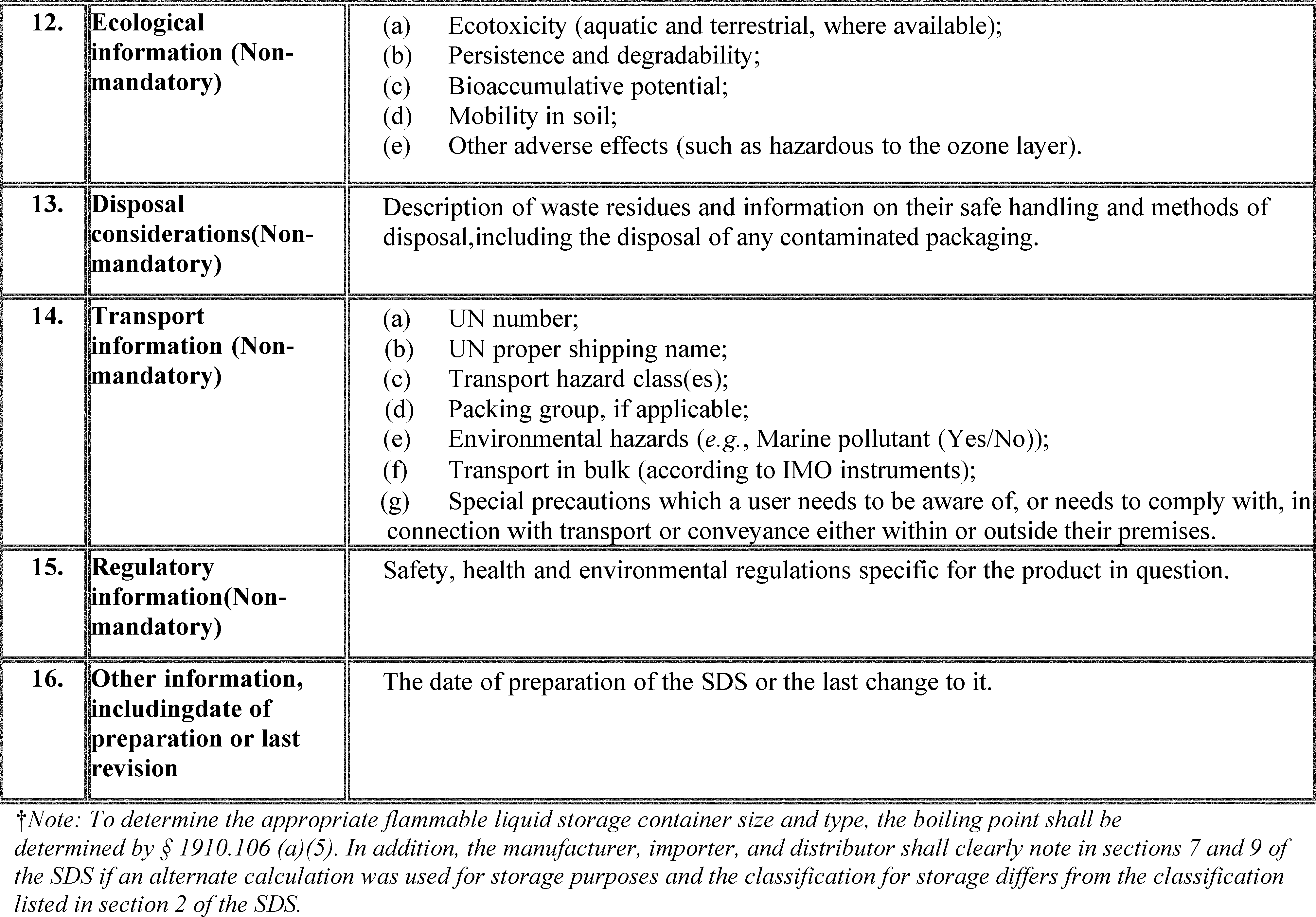 A safety data sheet (SDS) shall include the information specified in Table D.1 under the section number and heading indicated for sections 1-11 and 16. While each section of the SDS must contain all of the specified information, preparers of safety data sheets are not required to present the information in any particular order within each section. If no relevant information is found for any given subheading within a section, the SDS shall clearly indicate that no applicable information is available. Sections 12-15 may be included in the SDS, but are not mandatory.